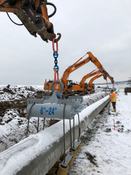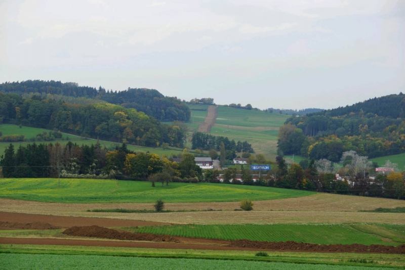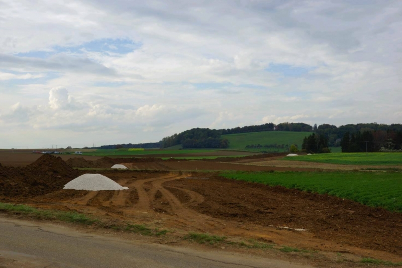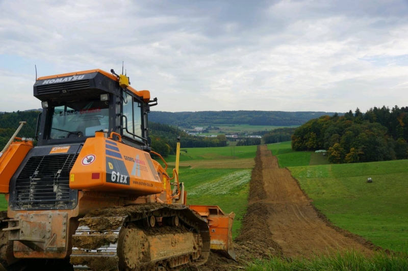 Nach dem Oberbodenabtrag ist ein Teil des Leitungsverlaufes der gut 3.500m langen Trasse bereits sichtbar. Die fast 100 Jahre alte Wasserleitung mit Nennweite 325mm wird gegen eine neue Stahlleitung mit Zementummantelung und Nennweite 600mm ausgetauscht. Mittlerweile wurde der erste Rohrstrang abgesenkt.