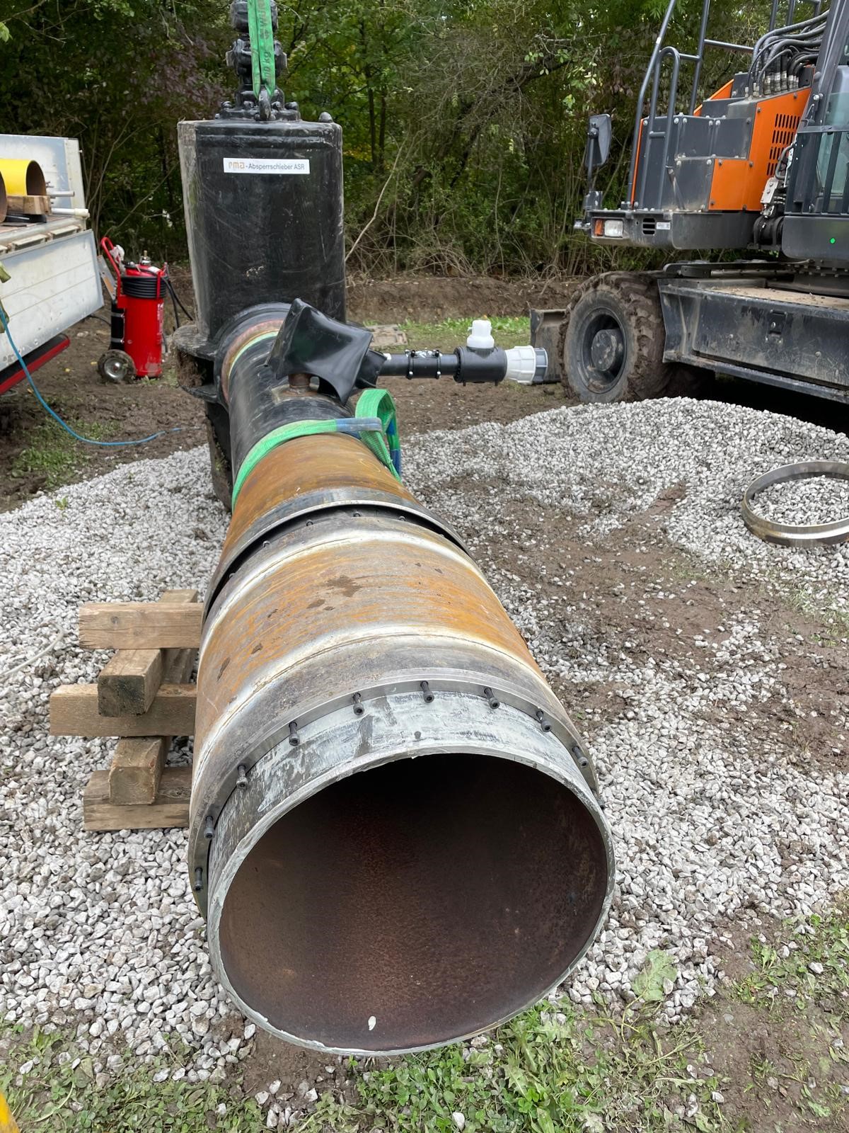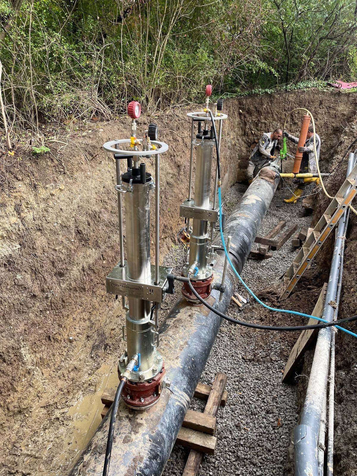 Für den Neubau eines Gaswerkes in Schwäbisch Hall waren umfangreiche Arbeiten notwendig. Zum ersten Mal im Einsatz war hier unser Blasensetzgerät Größe 6 von Hütz & Baumgarten. Die Stahlleitung mit Nennweite DN500 wurde damit bei einem Druck von 700mbar gesperrt und neue eingebunden.