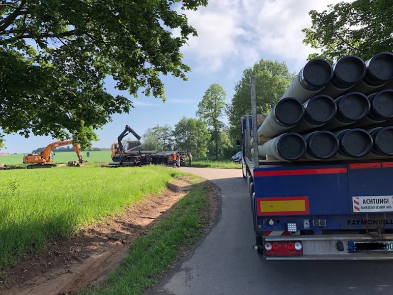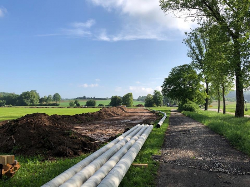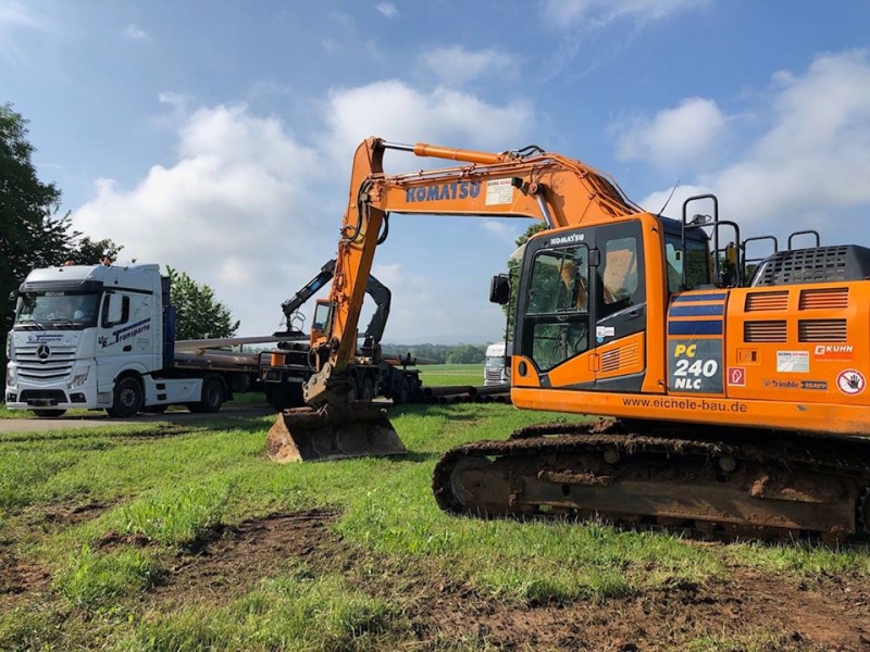 3.08 km Trinkwasserleitungen mit den Nennweiten DN200 und DN250 werden zur Zeit in der Nähe von Ellwangen angliefert und austrassiert. Im Zuge der Trassenführung müssen insgesamt 3 Straßen und der Goldrainbach gekreuzt werden.